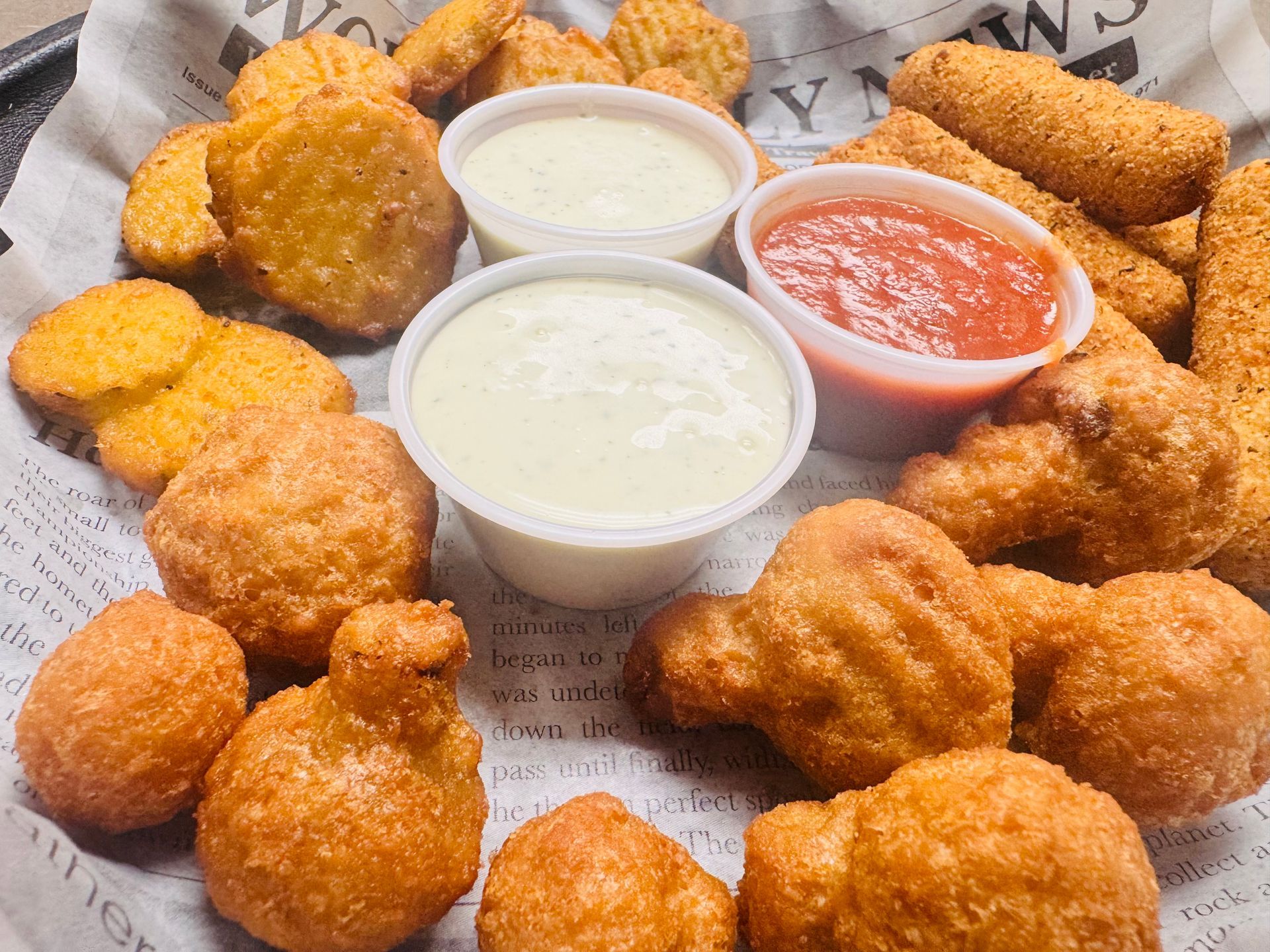 Fries- crinkle-cut, curly, beer battered, tots or chips.