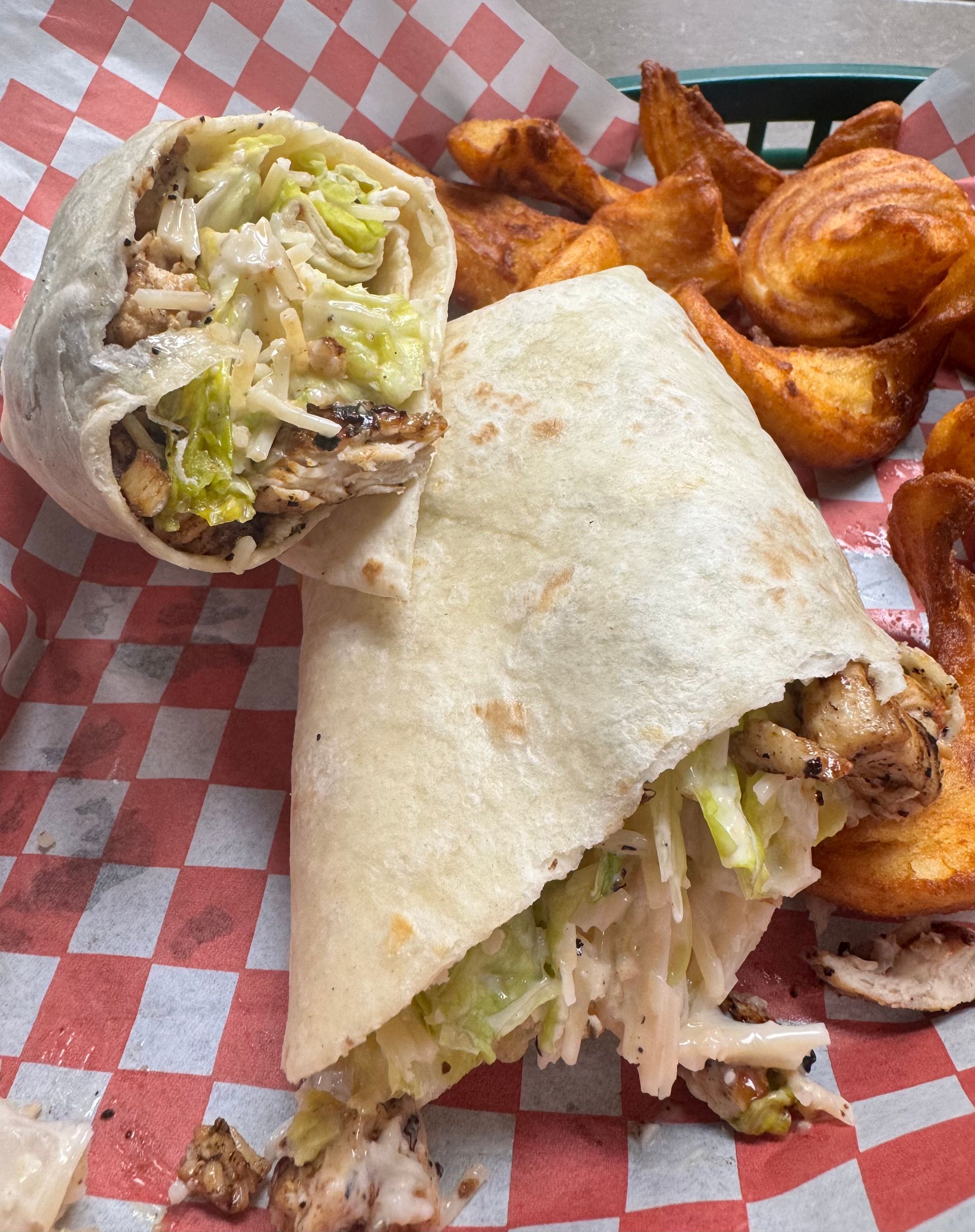 Griled or fried chicken with romaine lettuce, parmesan, and Caesar dressing wrapped in a tortila.