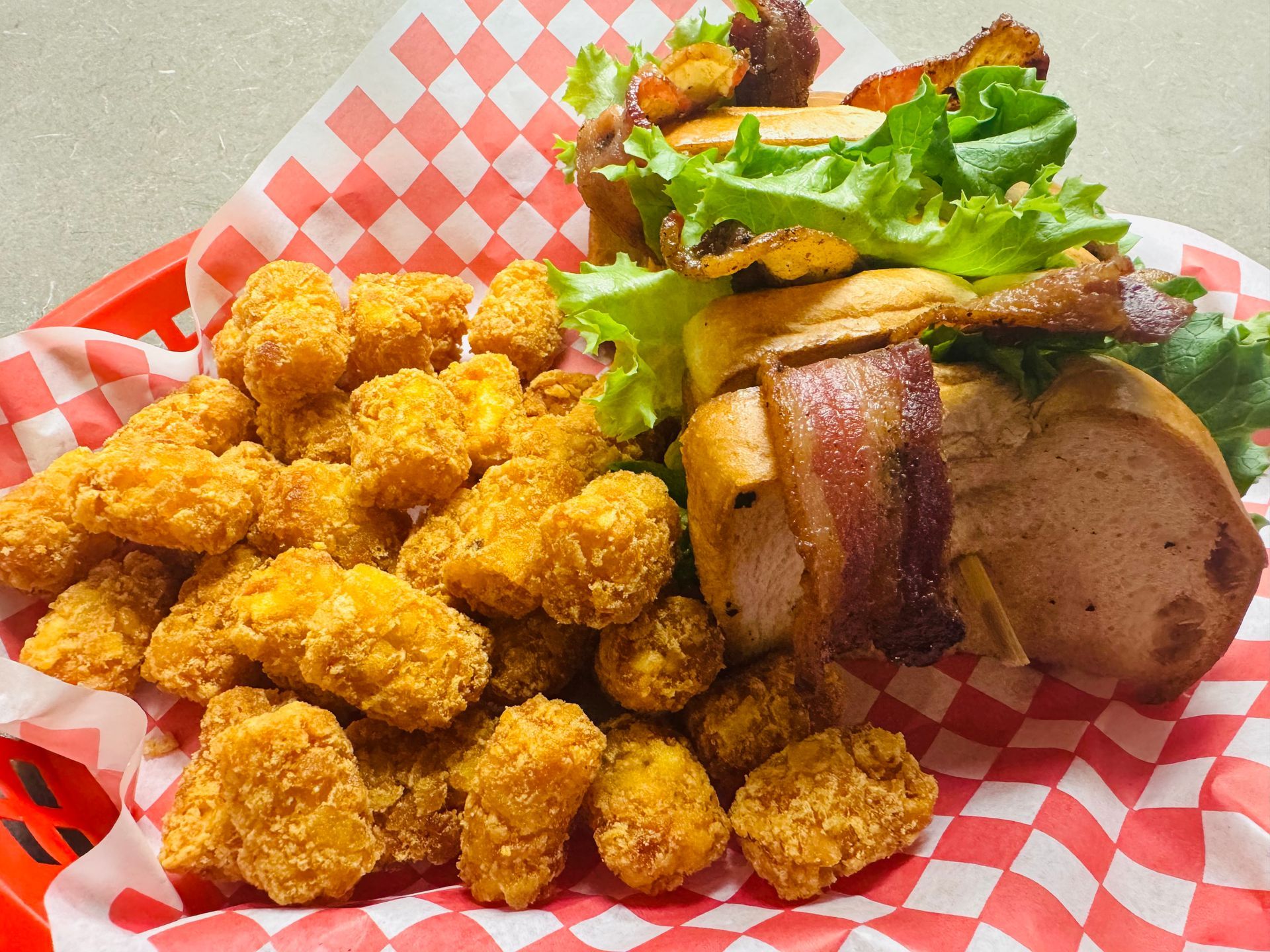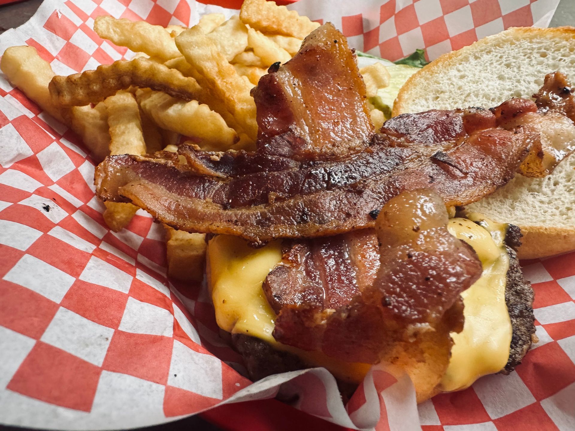Extra thick slice of bologna fried and topped bacon, lettuce, tomato on a bun with your choice of cheese.